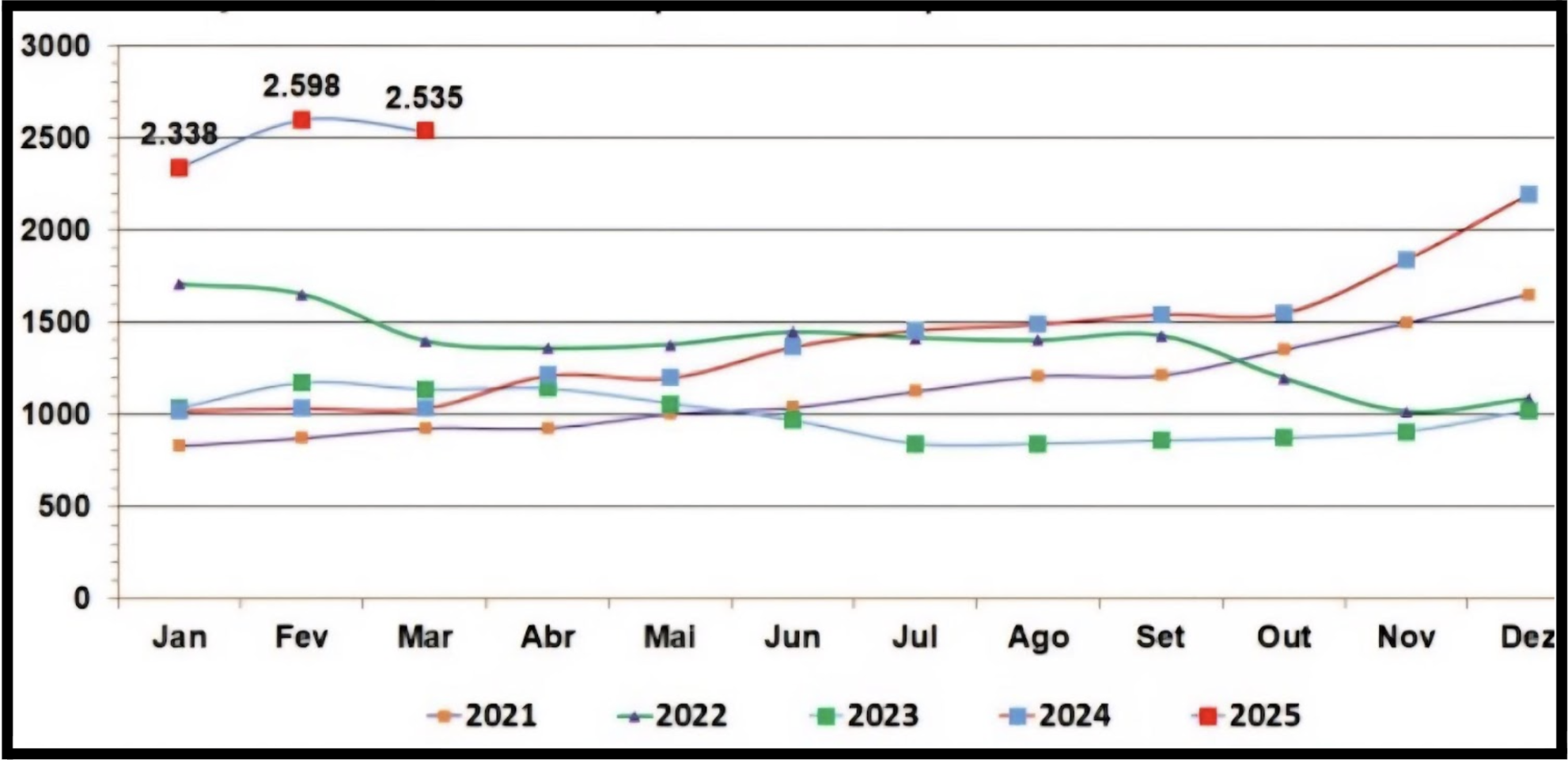 2025 deve registrar uma retração estimada em 4,4%. Por esse motivo, não se antecipam reduções expressivas nas cotações ao longo da temporada. Em Minas Gerais, o preço médio pago ao produtor pelo café Arábica tipo 6 foi de R$ 2.534,90 por saca de 60 kg em março, representando uma queda de 2,4% em relação ao mês anterior. Já o café Conilon tipo 7, no Espírito Santo, registrou preço médio de R$ 1.919,82 por saca de 60 kg, com retração de 2,7% no mesmo período.