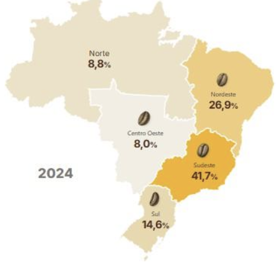 Além da escassez de matéria-prima, o aumento no consumo interno também contribuiu para a elevação dos preços do café. Segundo dados da ABIC (2025), o consumo no Brasil cresceu 1,11% em 2024, alcançando 21,916 milhões de sacas. Na figura 02, mostra que na região Sudeste liderou esse consumo, com 41,7% do total, seguida pelo Nordeste (26,9%), Sul (14,6%), Norte (8,8%) e Centro-Oeste (8,0%). Em média, cada brasileiro consumiu cerca de 1.430 xícaras de café ao longo do ano. Esse crescimento reflete não apenas a força do hábito, mas também reforça a pressão sobre a oferta, influenciando diretamente o valor do produto no mercado.