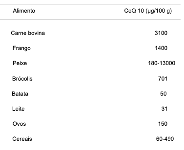 A CoQ10 é sintetizada pelas células humanas, mas também pode ser obtida a partir da alimentação, sendo as principais fontes alimentares como carne vermelha, ave e peixe. Pequenas quantidades são encontradas nos produtos lácteos, cereais, ovos, frutos secos como as nozes e nos vegetais, principalmente espinafre e brócolis. A Tabela 1 apresenta as principais fontes alimentares e as quantidades de CoQ10 presentes.