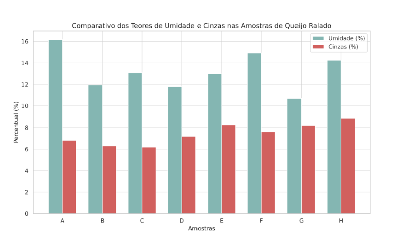 Neste contexto, foram realizadas análises de umidade e cinzas em amostras comerciais de queijo ralado e parmesão ralado, com o objetivo de verificar a conformidade com os padrões exigidos pela legislação brasileira. As análises foram conduzidas por estudantes do curso de Engenharia de Alimentos, como atividade de prática aplicada ao controle de qualidade de alimentos, aproximando o ensino superior da realidade industrial e comercial.