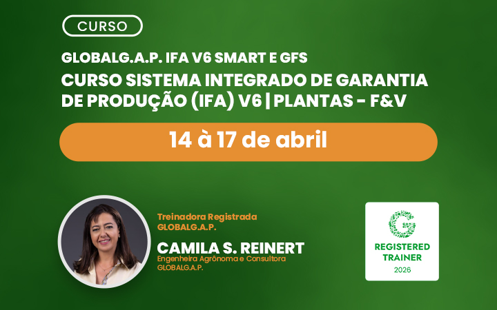 O GTA abre nova turma do treinamento GLOBALG.A.P. IFA V6 SMART e GFS – Sistema Integrado de Garantia da Produção (Plantas – F&V), voltado a profissionais que atuam na produção agrícola e buscam alinhamento com um dos principais sistemas de certificação reconhecidos internacionalmente.