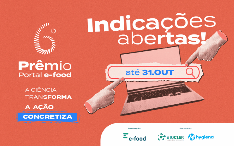 As indicações estão abertas para o 6º Prêmio Portal e-food, a maior premiação da área de segurança de alimentos que reconhece o que há de mais relevante na academia e no mercado. O período de indicação vai do dia 20/10 até 31/10/2025. Nesta fase, qualquer pessoa pode indicar um artigo, professor, liderança e projeto final de graduação. Também é permitido indicar a si mesmo, ou fazer campanha para receber indicações. Confira o regulamento para saber se a sua indicação está apta a participar.